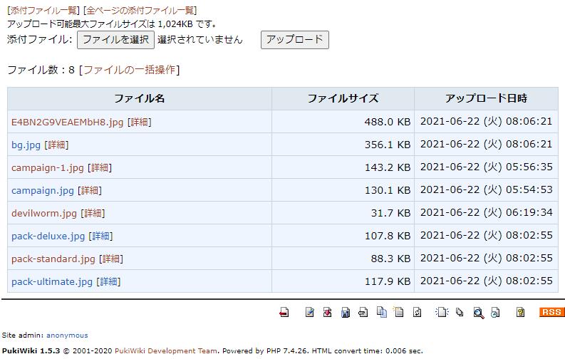 そのページに添付されたファイルの名前、ファイルサイズ、アップロード日時を表で一覧表示する。