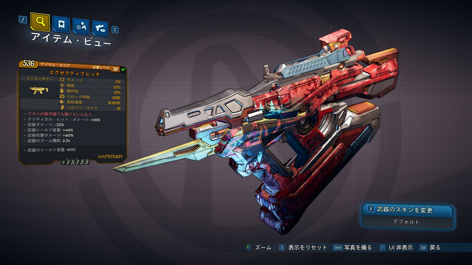 | ・クリティカル・ヒット・ダメージ: +65% ・武器ダメージ: -% ・シールド容量: +% ・近接攻撃ダメージ: +60% ・武器のズーム機能: x |