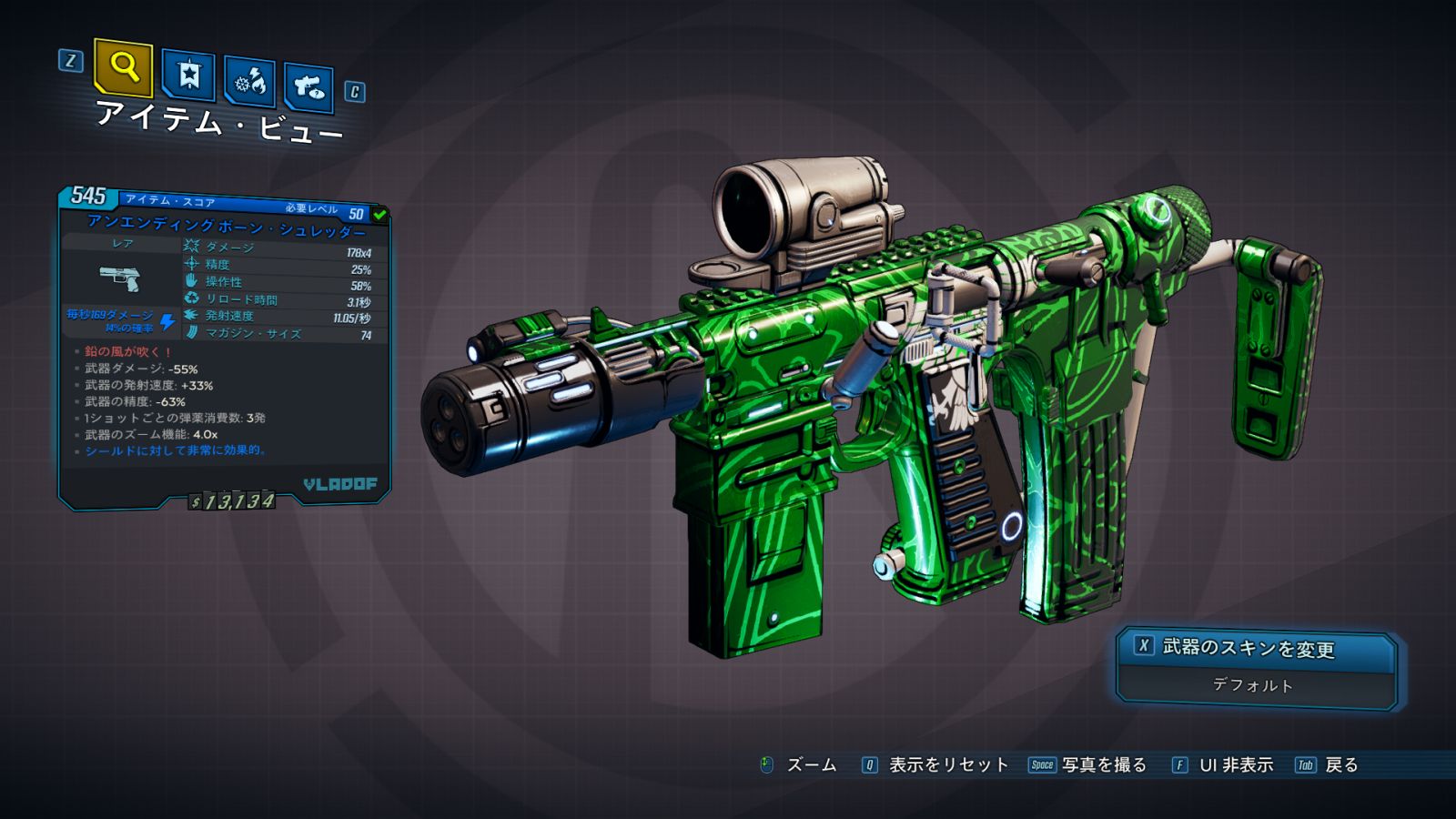 | Part_PS_VLA_Barrel_BoneShredder | 1発ごとの発射弾数: +4 マガジン・サイズ: +40 | ダメージ: -50% レティクルの拡大: +35% 照準の揺れ: +400% | ボーン・シュレッダー |