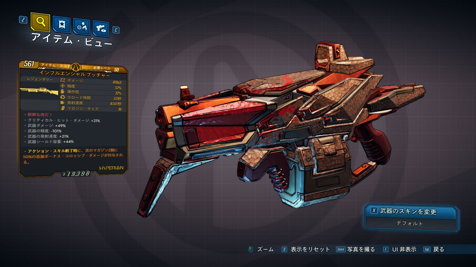 | ・クリティカル・ヒット・ダメージ: +% ・武器ダメージ: +% ・武器の精度: -% ・武器の発射速度: +% ・武器のシールド容量: +% ・武器のズーム機能: x |