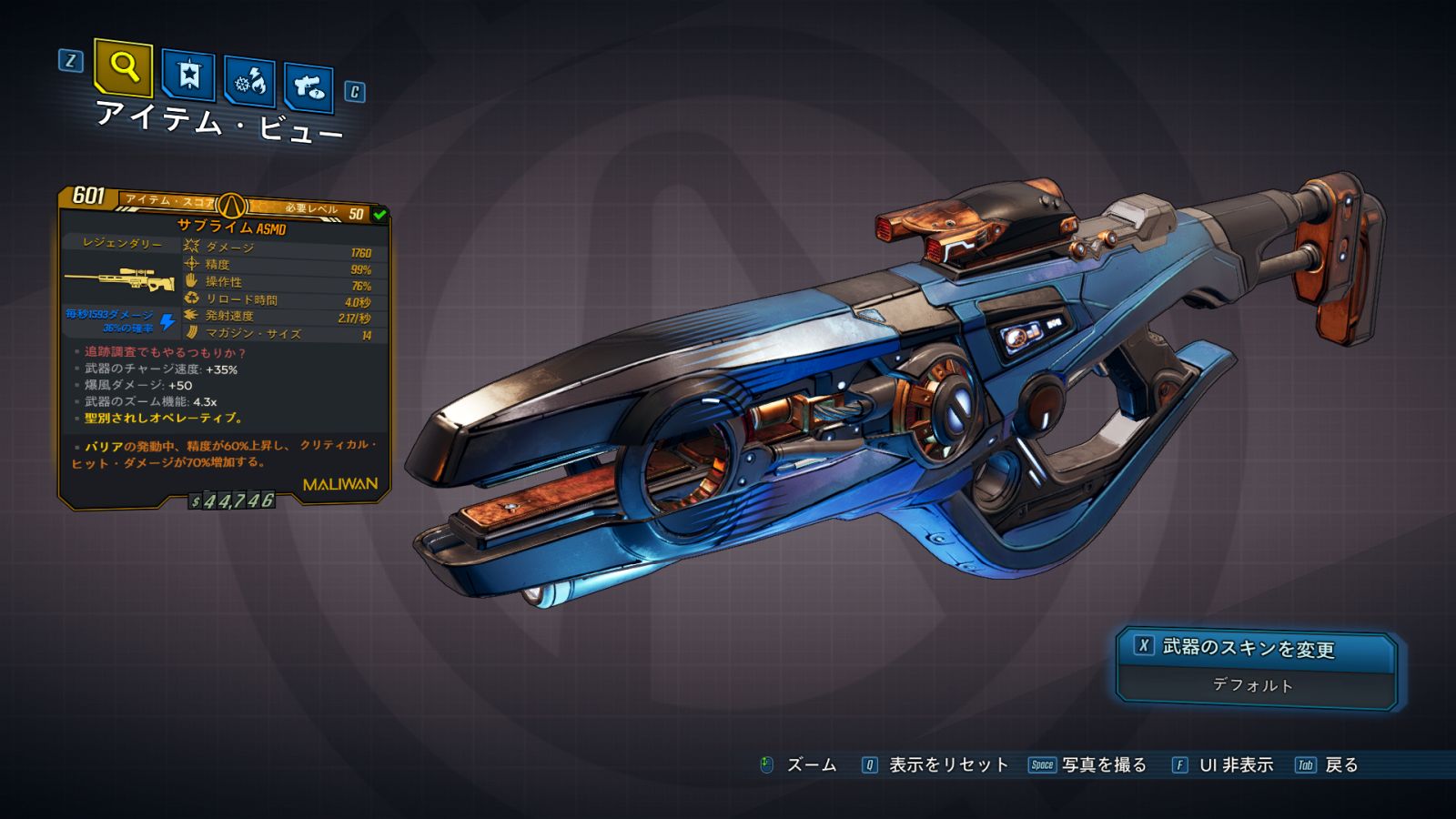 | ・武器のチャージ速度: +% ・爆風ダメージ半径: +50 ・ズーム機能: x |