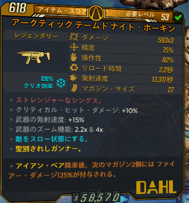 精度はとても良いがスナイパーライフルとして使うのは絶望的。発射レートも低くサム・フォー・ザ・ロードでの運用も考えられない。そのため使うとしたら唯一褒められる精度を捨ててショットガンモードで接近して弱点にぶち込む運用になる。火属性に火マガ125%を付けてHPが生身のみの敵に対して使うならダメージも通るがクラカタウを差し置いて使う意味を1mmも感じられない。