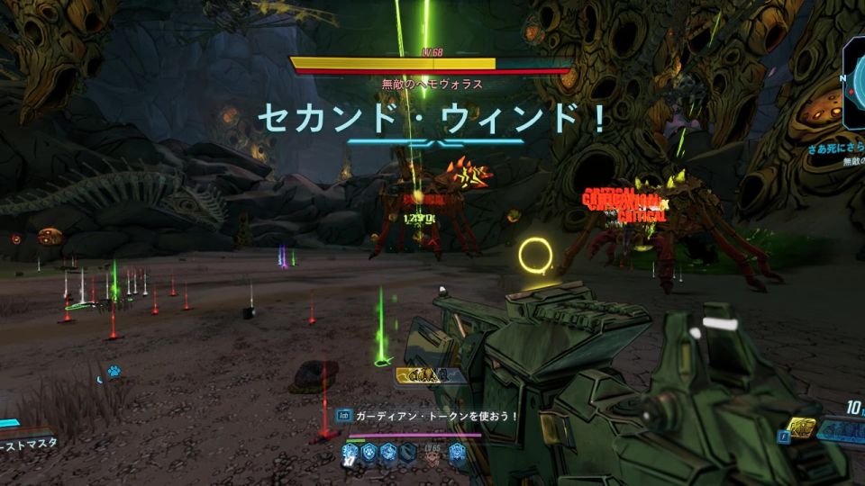 | クラップトラップが考えるには、あなたは実に実に実に実に危険な、無敵のヘモヴォラスという名のヴァーキッドと戦うべきだそうだ。通常ならクラップトラップの意見になど耳を貸さないが、今回は戦利品があまりに垂涎物と来ている。任務に同行して死期を早めることも厭わない4名のヴォルト・ハンターを集めたほうがいい。 |