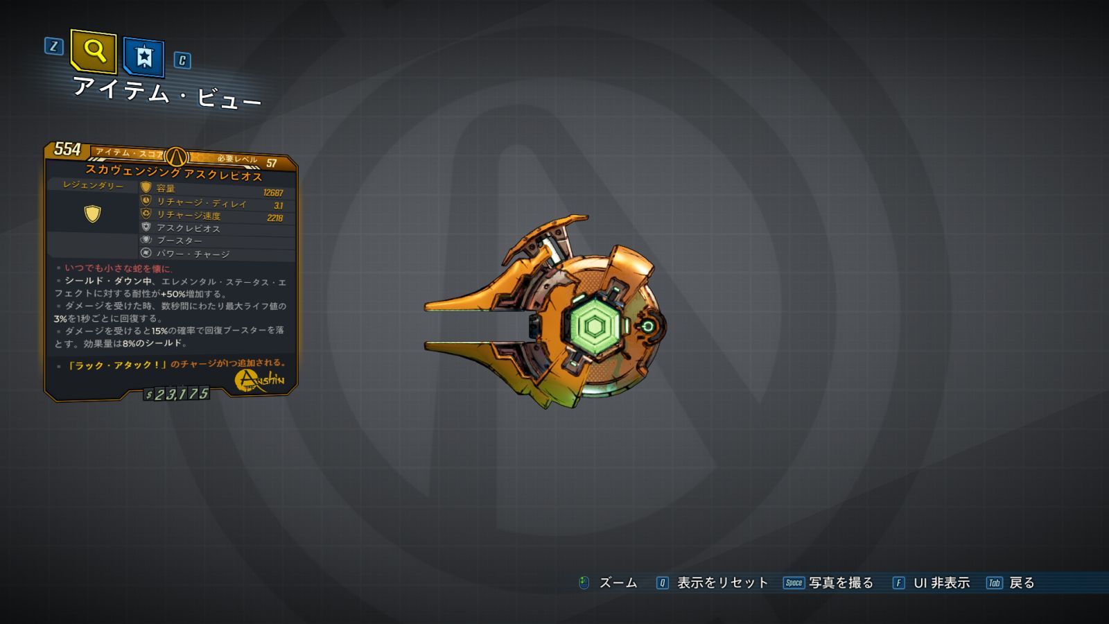 アンプ | 満タン時、 射撃がシールドの30/25/20%を吸収し、 武器ダメージ+20/+50/100%。 |