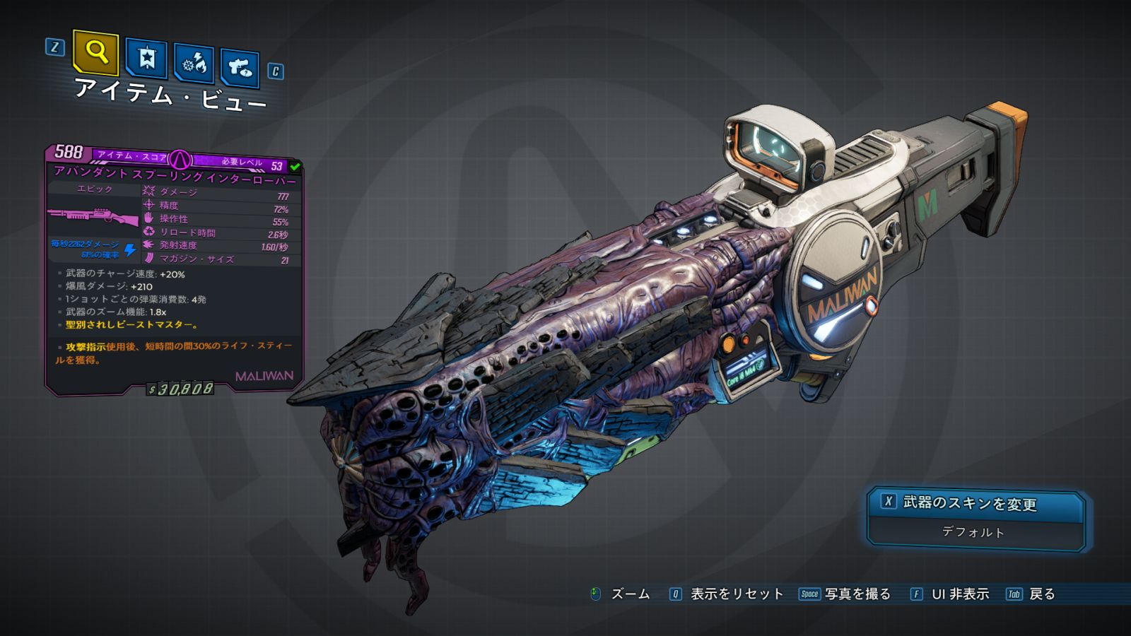 | Part_SG_MAL_Grip_02 | リロード時間: -5% | レティクルの拡大: +25% 照準の揺れ: +10% ダメージ: -30% | 同時発射数 x2 |