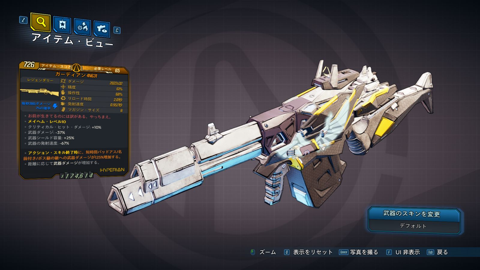 | Part_SG_Hyp_Barrel_Guardian | リロード時間: -25% 1発ごとの発射弾数: +9 | 発射速度: -67% | ガーディアン 4N631 |