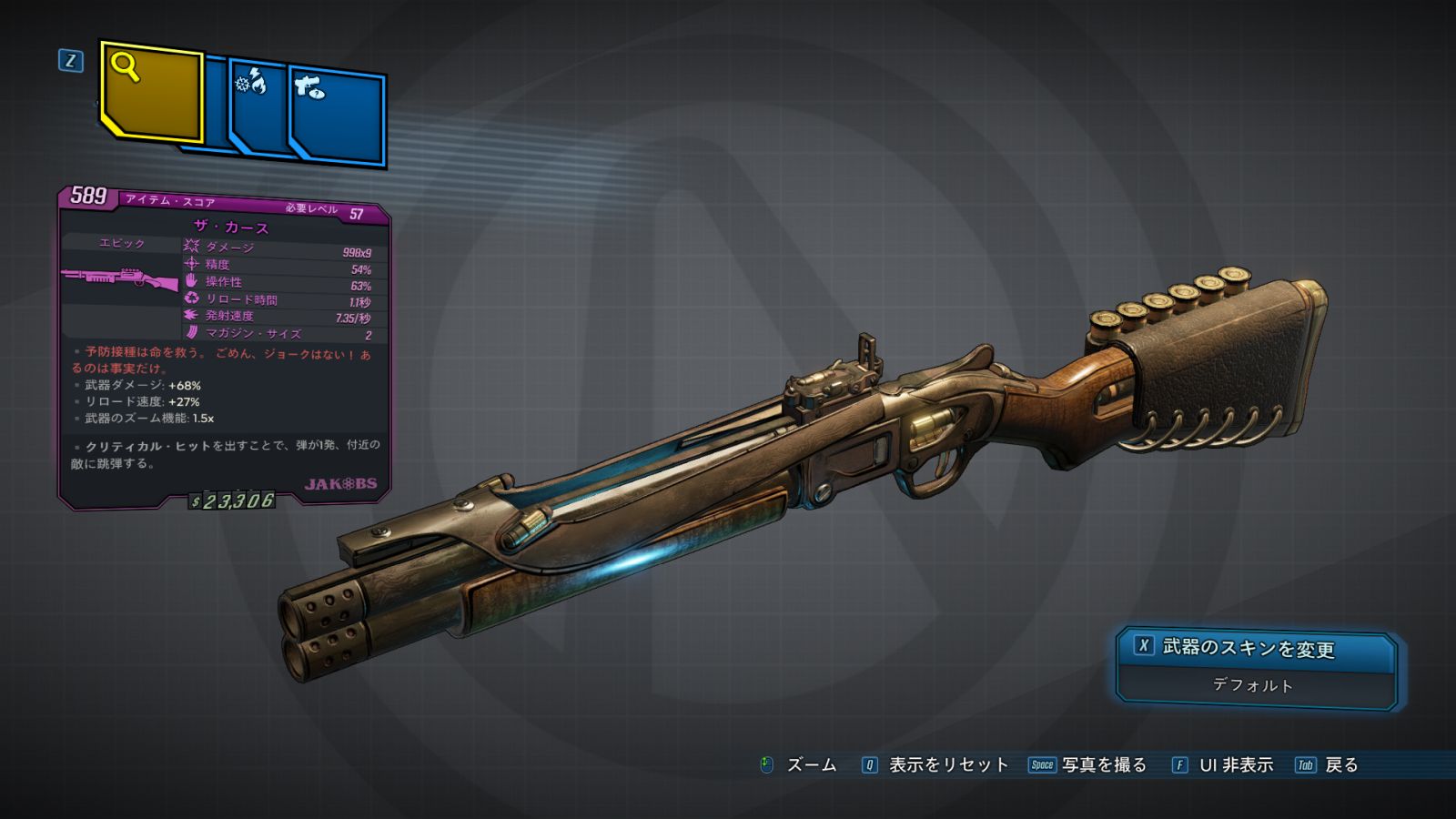 | Part_SG_JAK_Barrel_TheCure | 1発のごとの発射弾数: +9 ダメージ: +40% | | ザ・カース |