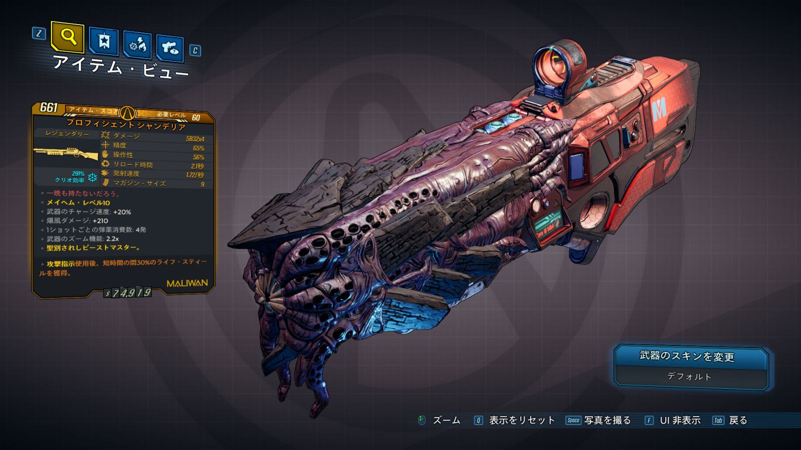 | Part_SG_MAL_Barrel_Antler_A | 弾速: +30% エレメンタル発動確率: +15% | | シャンデリア |