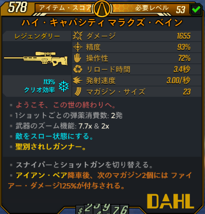 精度はとても良いがスナイパーライフルとして使うのは絶望的。発射レートも低くサム・フォー・ザ・ロードでの運用も考えられない。そのため使うとしたら唯一褒められる精度を捨ててショットガンモードで接近して弱点にぶち込む運用になる。火属性に火マガ125%を付けてHPが生身のみの敵に対して使うならダメージも通るがクラカタウを差し置いて使う意味を1mmも感じられない。