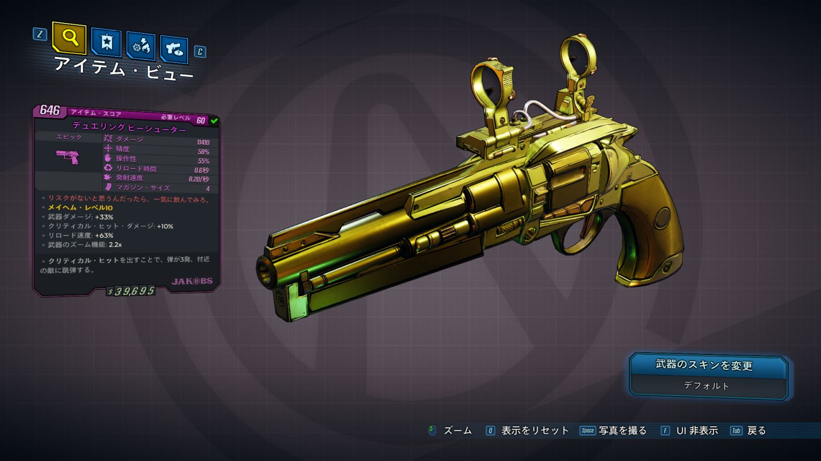 カテゴリ:アイテム 武器 ピストル ユニーク ジェイコブス ワールドドロップ 荒野のヴォルト・ハンター 聖別なし