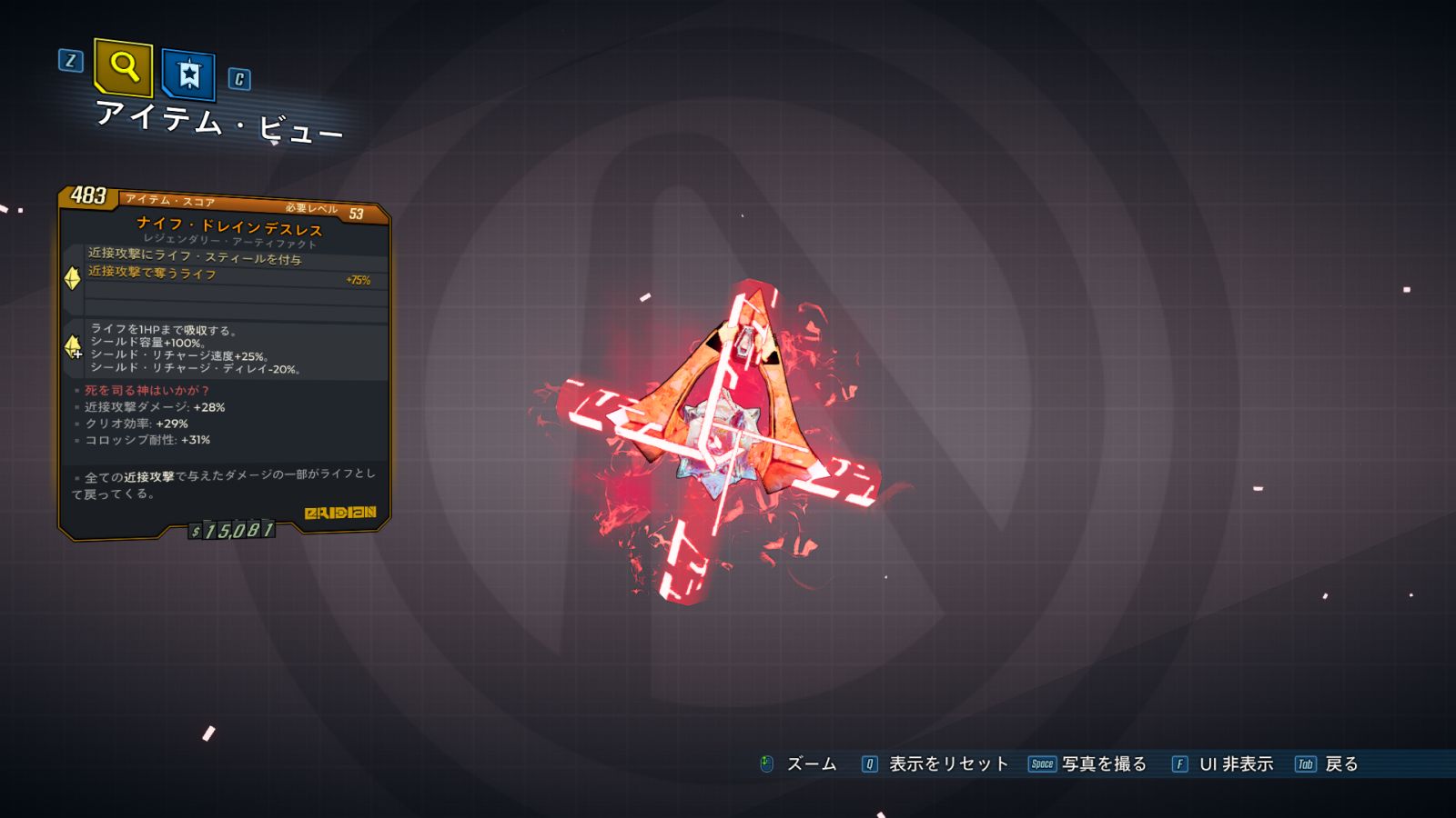 | ・ライフを1HPまで吸収する ・シールド容量: +100% ・シールド・リチャージ速度: +25% ・シールド・リチャージ・ディレイ: -20% |