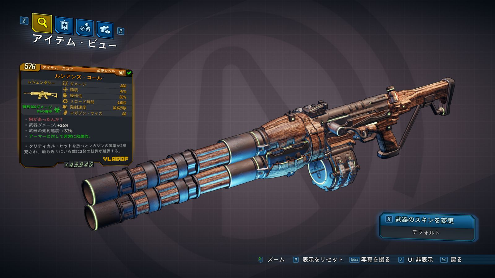 | ・武器ダメージ: +26% ・武器の発射速度: +33% ・武器のズーム機能: x |