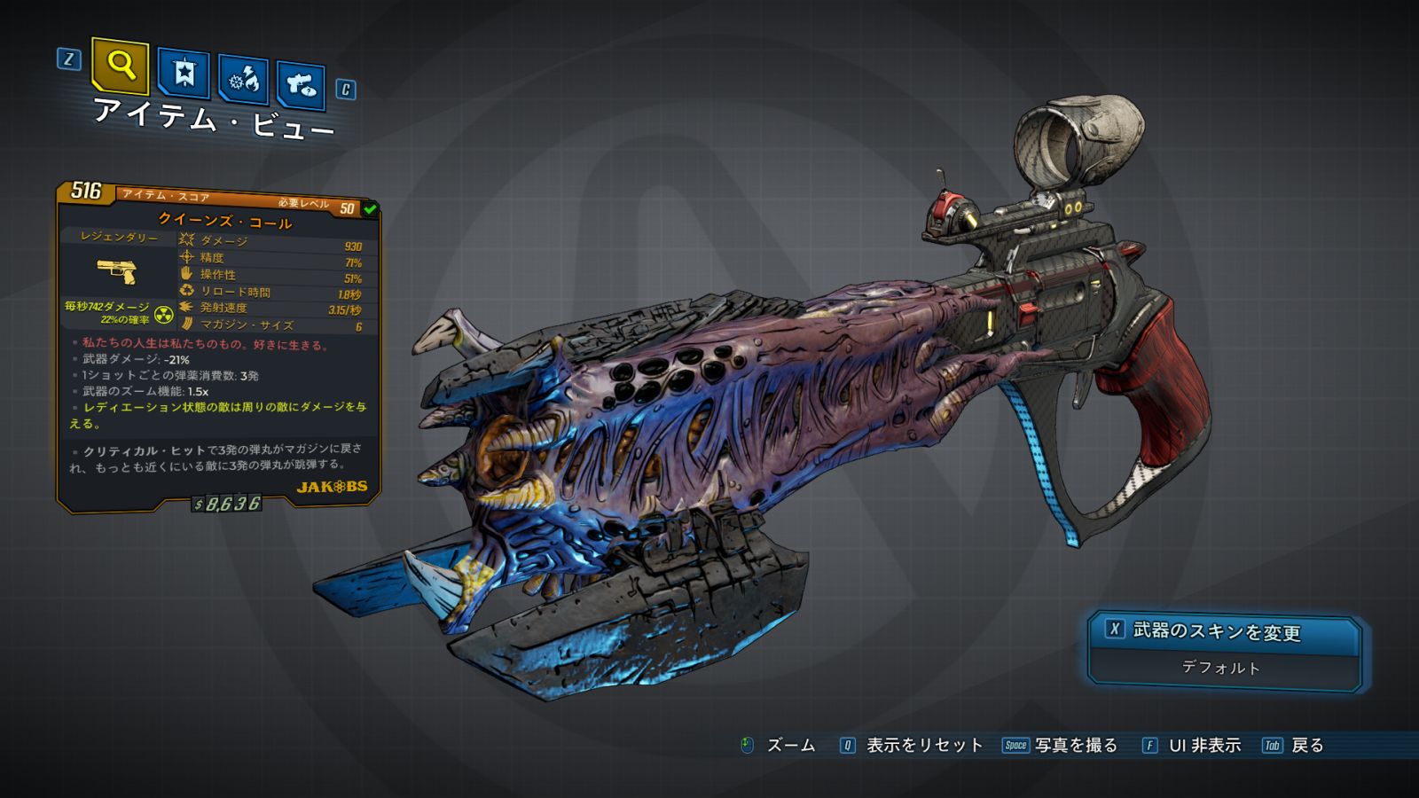 | ・武器ダメージ: -% ・1ショットごとの消費弾薬数: 3発 ・武器のズーム機能: x |