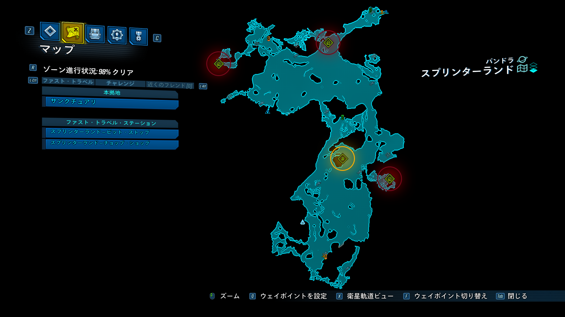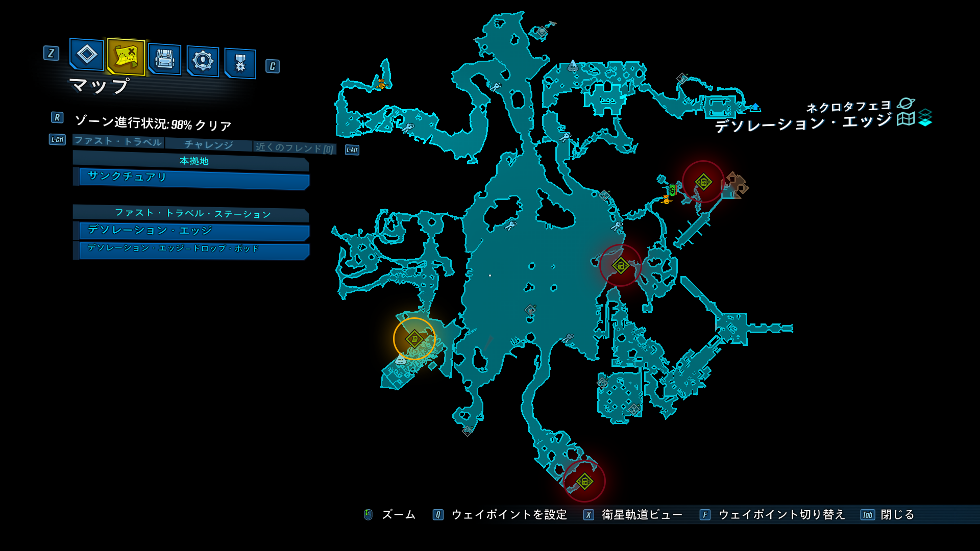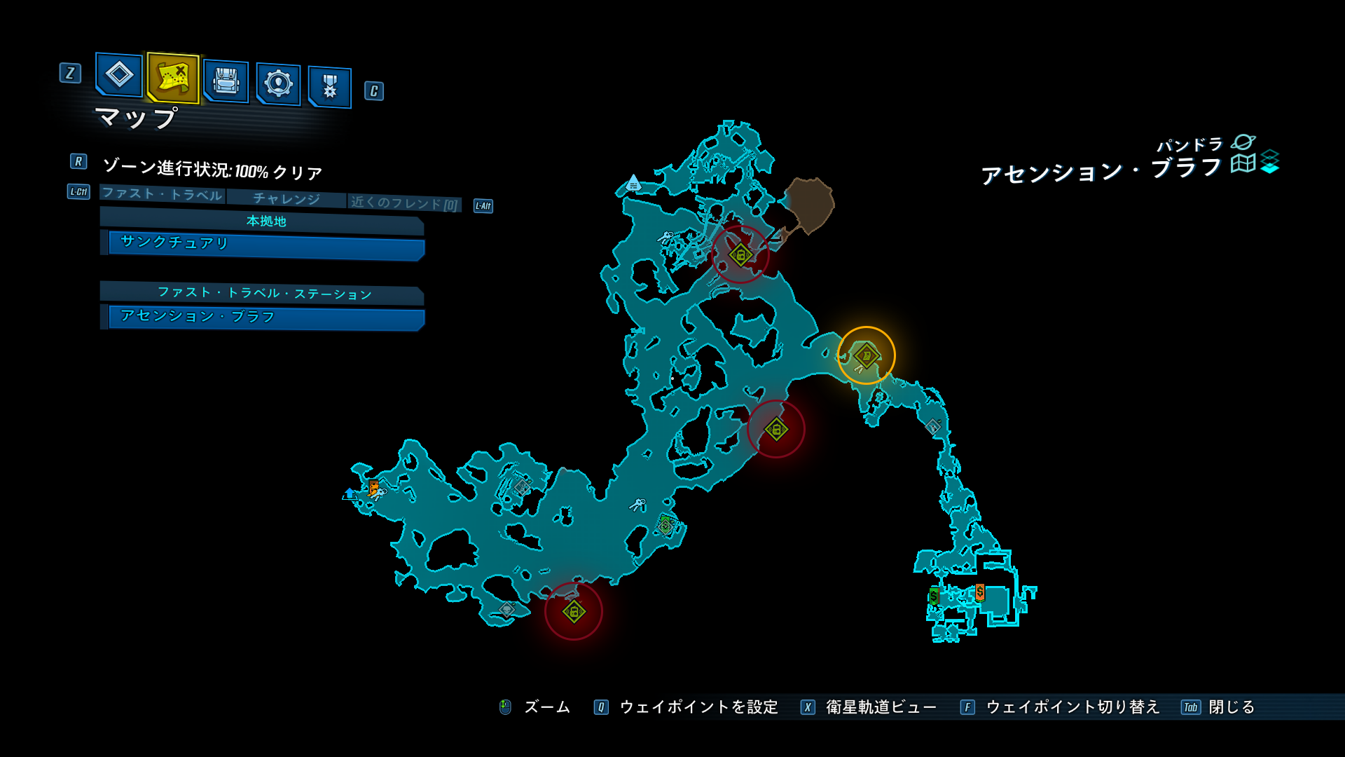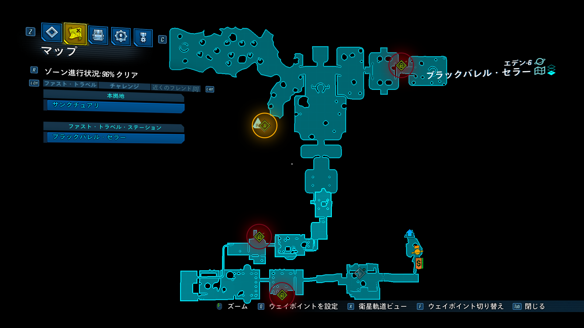 - 各ゾーンに伝説のヴォルト・ハンター「タイフォン」が残した日誌が3つあり、全て回収するとタニスがお宝の場所を割り出してロックを解除してくれる。