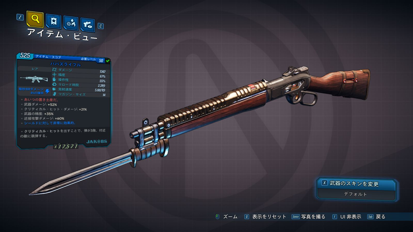 ジェイコブス製としては珍しいエレメンタル付きのセミオート・ライフルで、クリティカル・ヒット時に3発の弾が跳弾する。