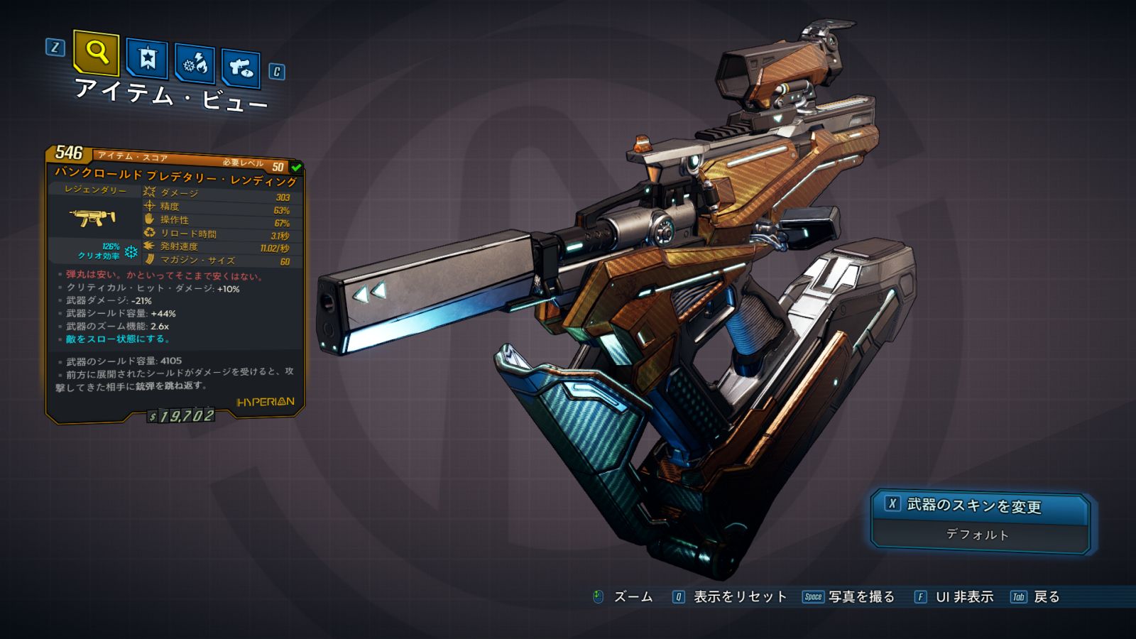 | ・クリティカル・ヒット・ダメージ+% ・武器のシールド容量+25% ・武器のズーム機能2.6倍 |