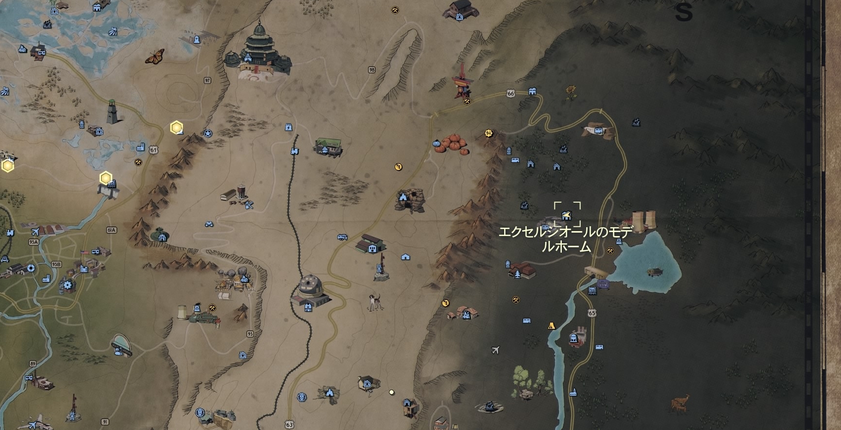 南西にエラ・エイムズのバンカーやドリー・ソッズ自然公園、西にガルパー・ラグーン、北西に狩人の小屋や放棄されたバンカー、北にサウサンプトン・エステートや高原の沼地、北東にアビーのバンカー、東にサンダーマウンテン発電所、南東にクレバスダム。沼地地帯の北部、荒れた境域と沼地地帯とを隔てる山とこの地を南北に走る65号線との間の林の中に位置している。