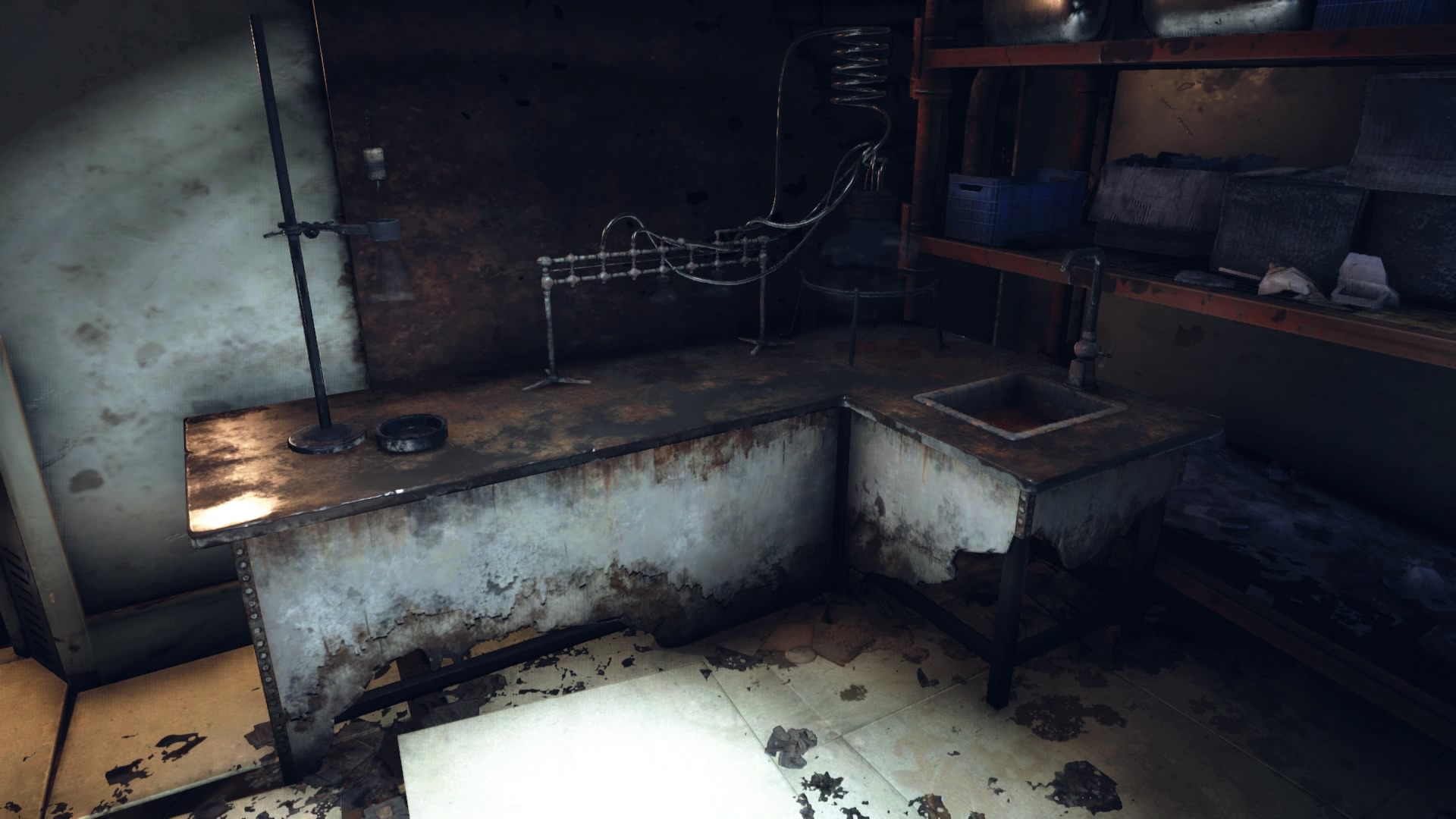 「回復」はRADアウェイやスティムパックなどの回復薬の作製、「薬物」はオーバードライブやサイコなどの薬物の作製、「被爆植物」は各種溶剤などの作製、「精錬」は鉄鉱石や鉛鉱石などの各種鉱石を素材化するのに用いる。