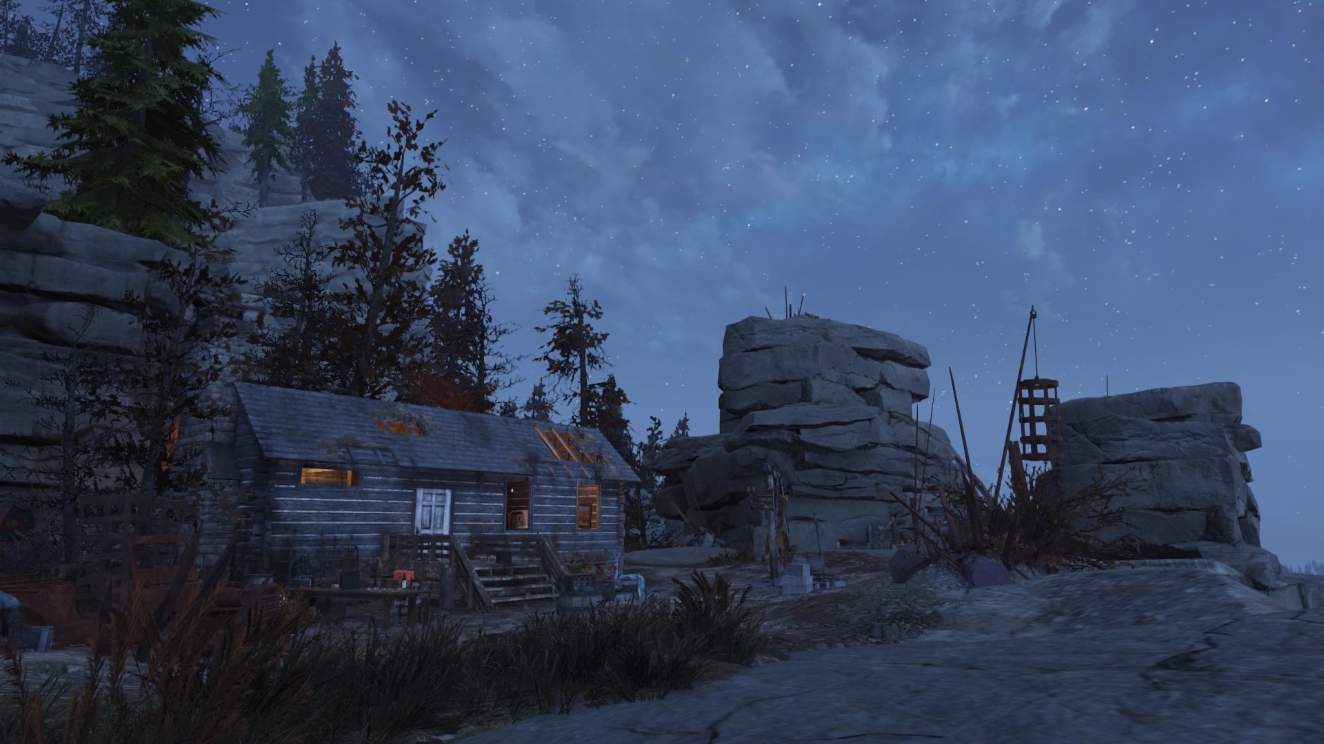 ログハウスの周囲に、救急箱、クーラーボックス、袋、弾薬ボックス、道具箱(必要スキル0)、無線、弾薬、双眼鏡、塩、コショウ、ラッドスタッグの死骸などのほか、キツネの皮、ウサギの皮、ビールのビン、ウィスキーのビン、簡易バッテリー、エナメルバケツ、キャットボウル、アルミ缶などのジャンクが散在。シルト・ビーンやアスターなどの植物が自生している。