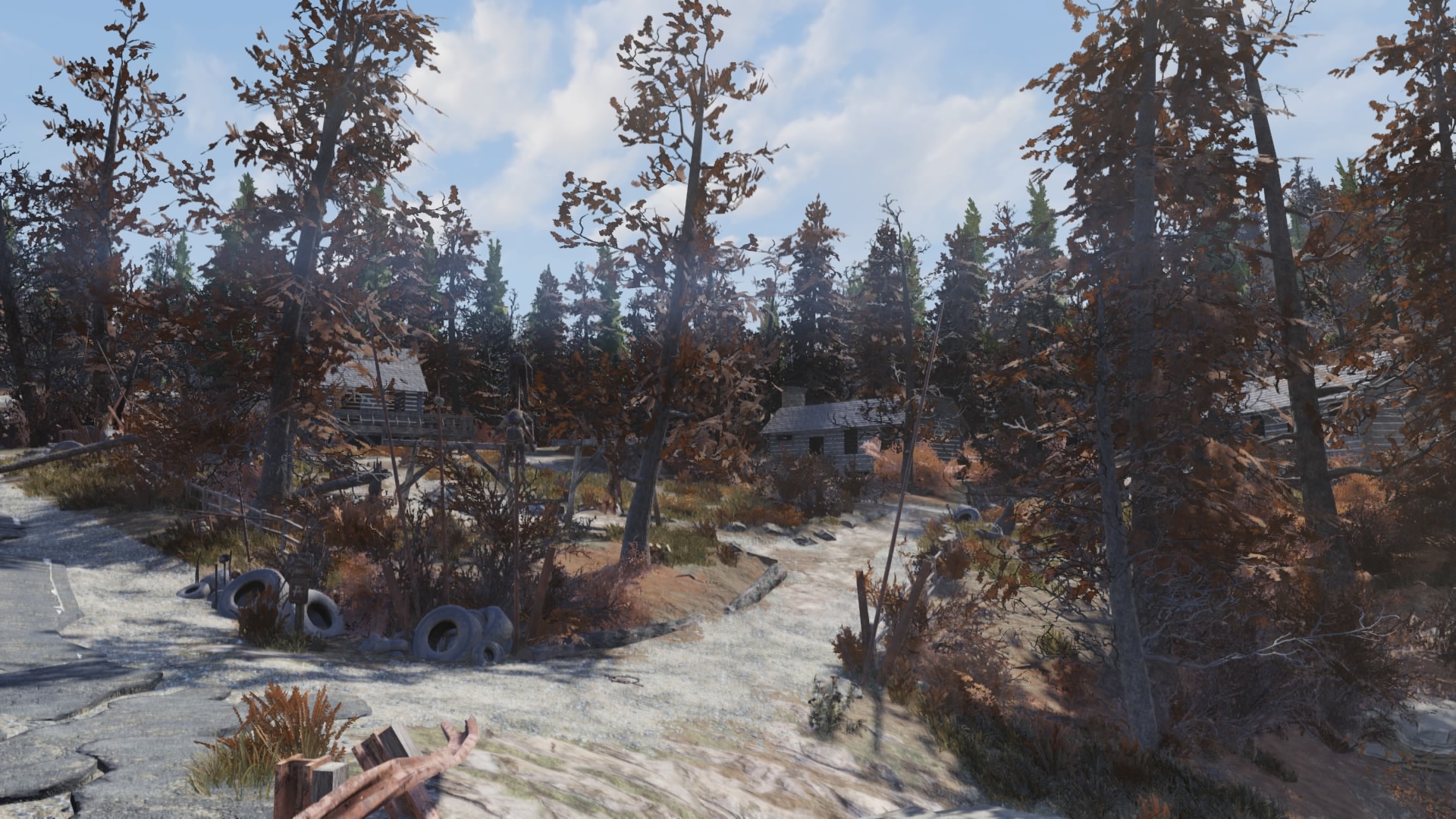荒れた境域に所在する山荘地。複数のログハウスと各種アイテムなどが散在している。