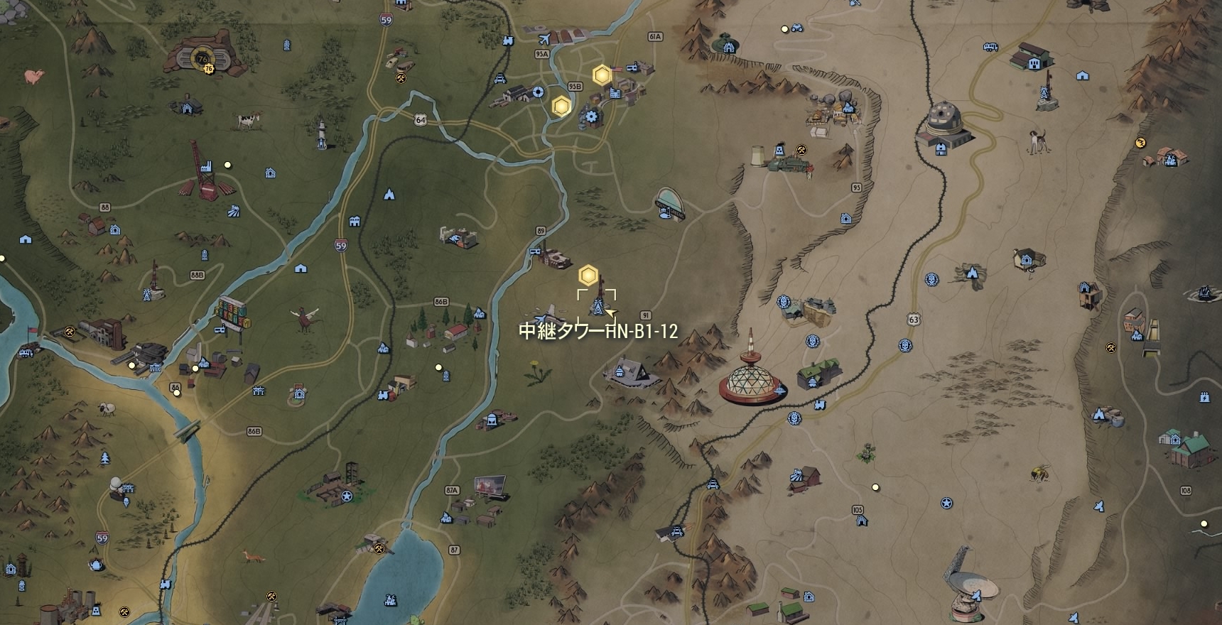 | 付近のロケーション | ホワイトパウダー・ウィンタースポーツ、ホライゾンズ・レスト、グレッグの鉱山雑貨店、ボルトン・グリーンズ、ママ・ドルスの食品加工、Vault-Tec大学、モーガンタウン |