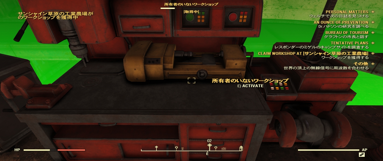 まずはエリア内にいる全ての敵を排除し、次にワークショップをインタラクトする。するとワークショップから一定の範囲が緑色の枠に囲まれるので、その枠の中に一定時間居ればワークショップの所有者として登録される。
