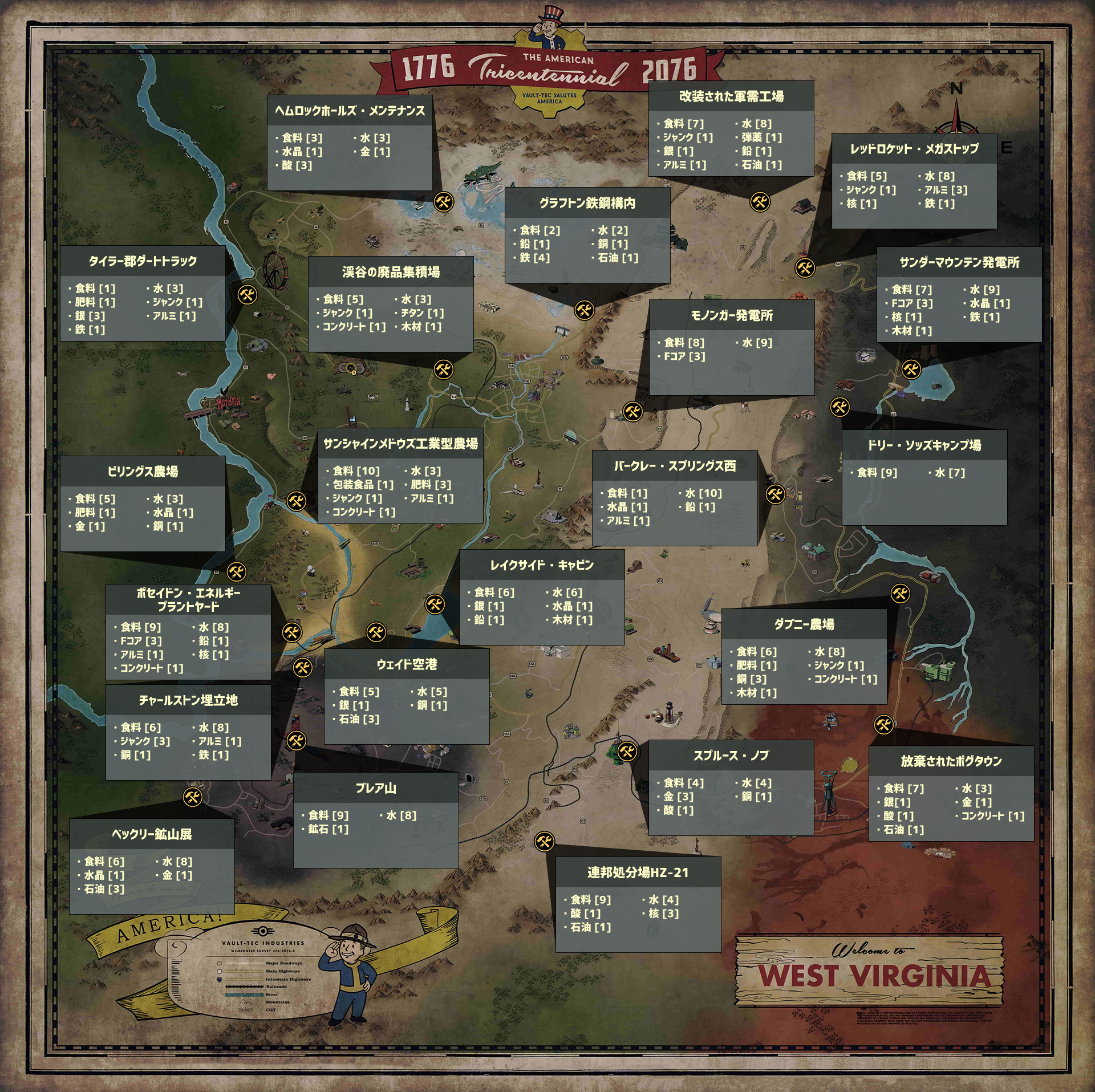 | 場所 | 食料 | 水 | 酸 | 石油 | ジャンク | 肥料 | コンクリ | 木材 | 核 | 水晶 | アルミ | 鉄 | 鉛 | 銅 | 銀 | 金 | 固有 |