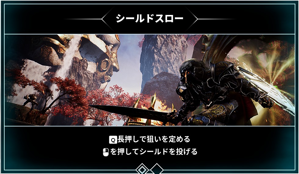 - スキル:シールドスロー (レベル1)。シールドを弧を描くようにして投げ、軌道上にいるすべての敵にダメージを与える。