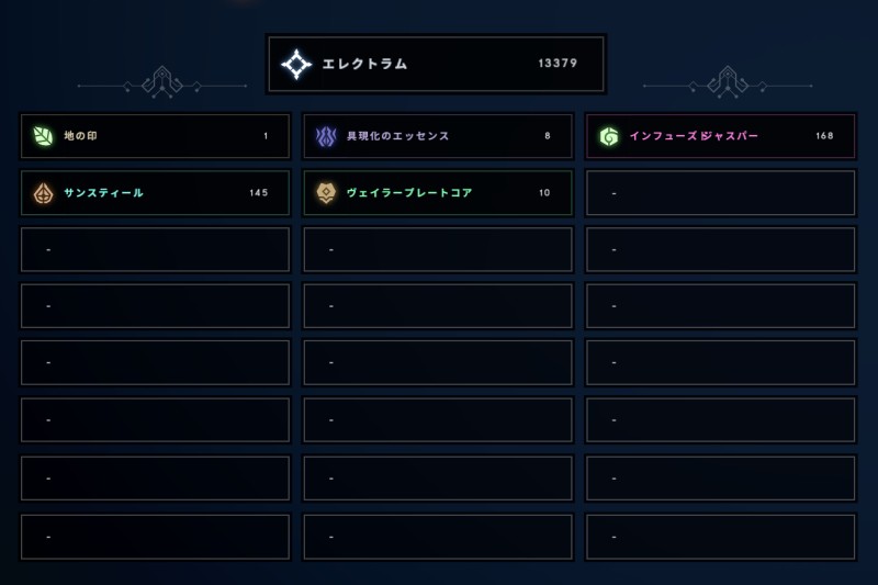素材は敵や宝箱からのドロップ、装備のサルベージ、領界の探索やミッション報酬などで得られ、装備の強化やヴェイラープレートの製作、ドリームストーンや試練の塔といったエンドゲーム向けのコンテンツの開始時に使用する。