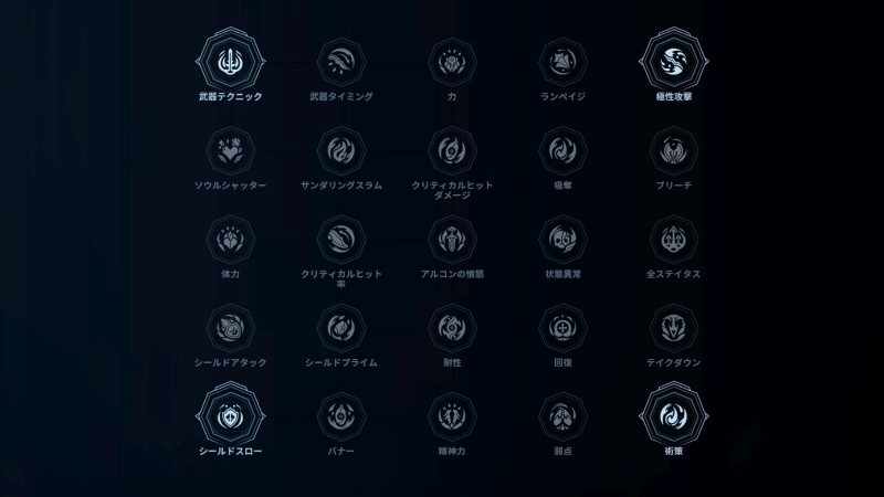 - 『Godfall』におけるスキルツリーは「スキルグリッド」と呼ばれる形で配置されていおり、スキルを取得すると隣接するスキルが開放され取得できるようになる。初期時はグリッドの4隅にあるスキルのみ取得可能。