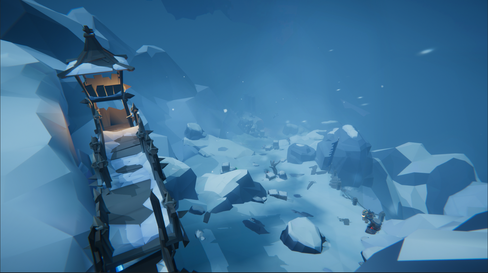 高低差のある雪山で入り組んだ狭い道を登っていく。