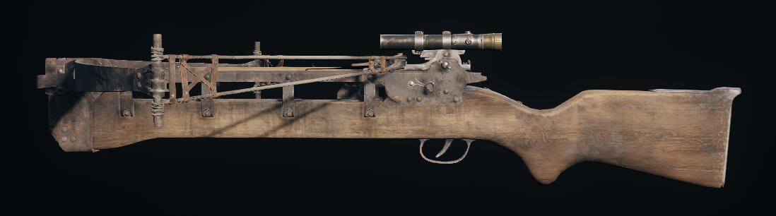 強力なボルトを発射するクロスボウ。遠距離から静かに攻撃をしかけられるが、取り回しは悪くリロードには時間がかかる。ボルトは回収して再利用可能。中距離用照準器を取り付ける改造が施されている。