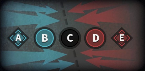 ①全部で7つの目標(A~G)があり、互いに3つずつを制圧した状態でスタート。真ん中の中立な目標Dを奪い合う。