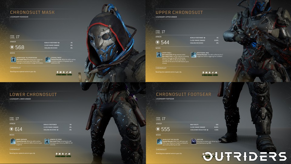ほぼすべての防具は全部位に同じ名前を持つ装備があるセットになっている。エピック以下の防具の場合は見た目に統一感が出る以外特に揃える利点はないが、レジェンダリーの場合は揃えることで特殊な効果を発揮する。