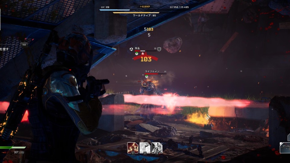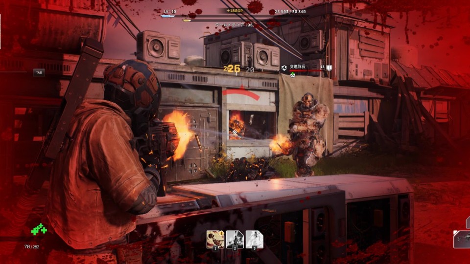 屋根のついた橋を通り抜けると、アイアンクラッドが出現する。アイアンクラッドはチェーンガンの掃射による絶え間ない攻撃が驚異的だが、本人の動きは鈍重なので、ある程度距離を取りつつカバー間を移動すれば戦いやすい。ただ、同エリアにはマークスマンも出現するため、これを先に倒しておかないとカバー間の移動を邪魔されてしまう。マークスマンは建物高所に陣取っているため、一気に距離を詰めて倒すか、無理そうならスナイパー武器を使って狙い撃とう。