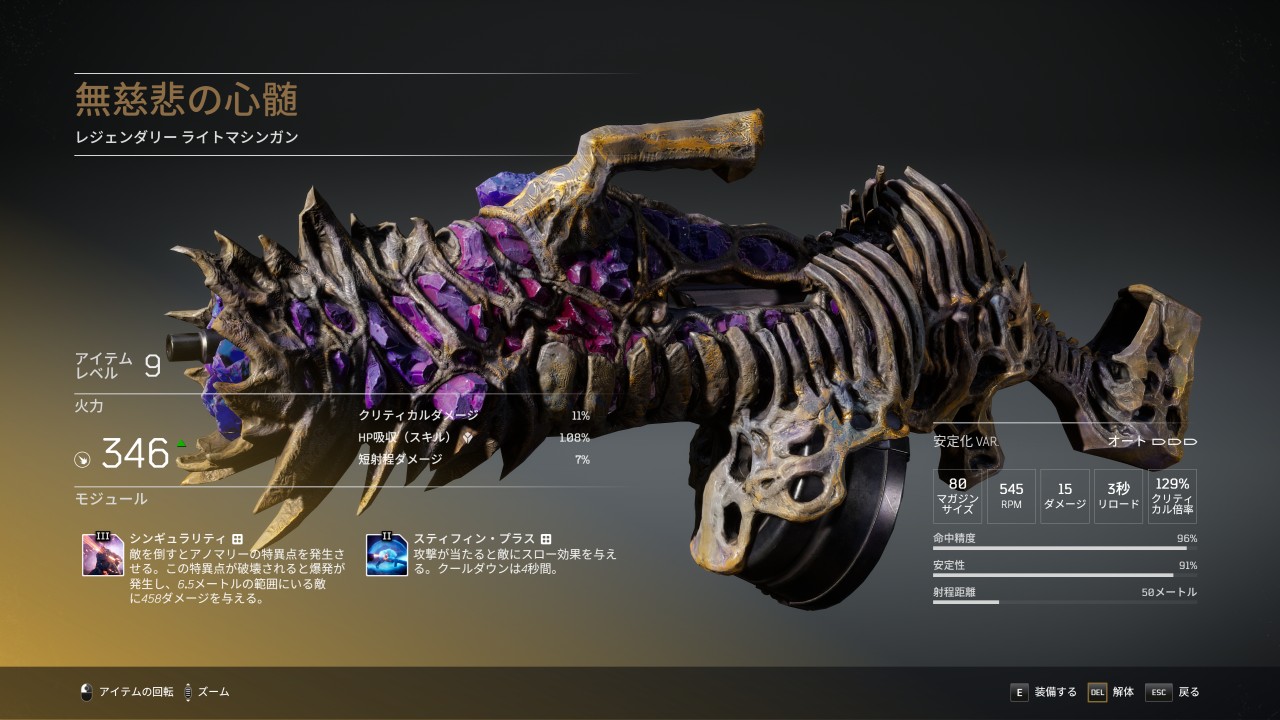 無慈悲の心髄は、ランダムでドロップするレジェンダリーのライトマシンガンで、デフォルトのバリエーションは安定化。
