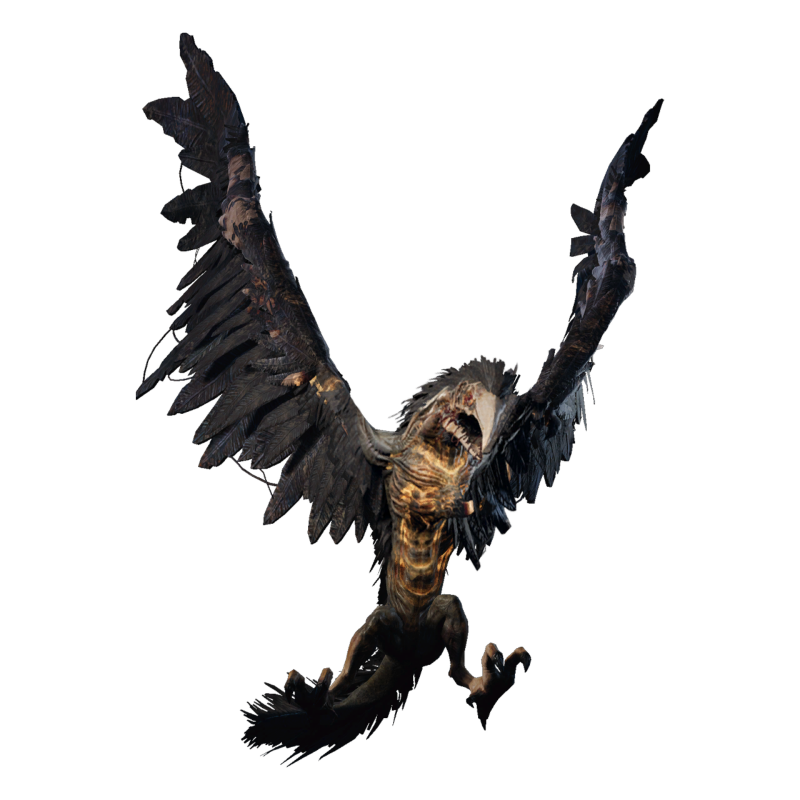 羽による攻撃は攻撃範囲が表示されず、予備動作からの攻撃開始が早いため、特に周囲に羽をばら撒く方の攻撃は避けるのが難しい。一直線に羽を飛ばすタイプの攻撃の場合、ローリングで横に回避すれば当たらずに済む。急降下による範囲攻撃は攻撃範囲こそ広いものの、範囲が表示されてから実際に攻撃に移るまでだいぶ余裕があるため、避けることはそう難しくない。ただ、空ばかり見ていると、地面の範囲表示を見逃してしまう危険性があるため、そこだけ注意が必要となる。急降下後はしばらく地上で無防備な状態を晒すので、ここで一気にダメージを与えるチャンスとなる。
