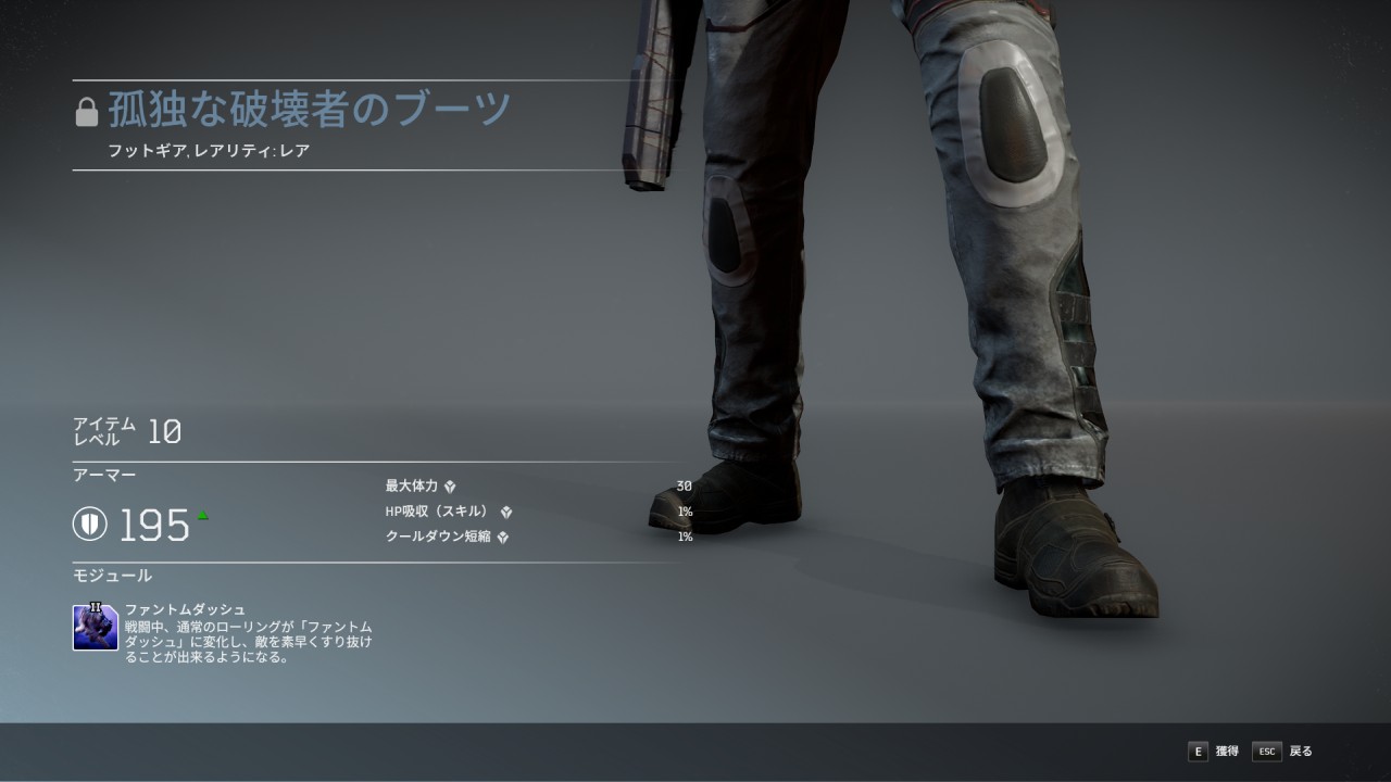 孤独な破壊者のブーツは、DLC「ヘルズ・レンジャーズ・パック」に含まれるレアのフットギアで、ボーナス特性に最大体力、HP吸収 (スキル)、クールダウン短縮、防具モジュールとしてファントムダッシュが付いている。