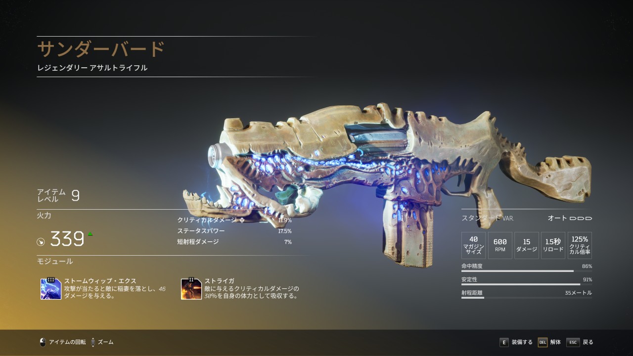 サンダーバードは、ランダムでドロップするレジェンダリーのアサルトライフルで、デフォルトのバリエーションはスタンダード。