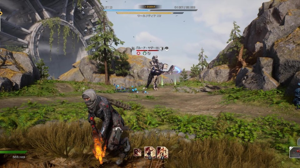 そして、距離を取りながら戦う中でも「サージ」と「パーフォレイト」の使用は警戒しておきたい。「サージ」はプレイヤーの位置を中心に広範囲のダメージエリアを一定時間形成するスキルで、エリアに触れていると高い継続ダメージを受ける。ダメージエリアの地面からはアノマリーの光がまばらに立ち上がっているが、これがやや見づらく、気づかずに触れてしまうことがある。ダメージ時の音なども特に無いため、うっかり踏んで大ダメージを受けてしまわないよう、地面にはよく注意を払っておこう。マルチプレイ時は各プレイヤーの足元にダメージエリアが形成されるため、お互いの立ち位置にも注意しておく必要がある。「パーフォレイト」は強力な飛びかかり攻撃で、マザーが一度大きく飛び上がってから高速でプレイヤーのもとに突撃してくる。当たると即死級のダメージを受け、ノックバックによってしばらく操作不能に陥る。厄介なスキルだが、接触する直前に後ろへローリングすることで回避が可能。ただし、タイミング次第ではダメージがなくてもノックバックだけ発生することがある。