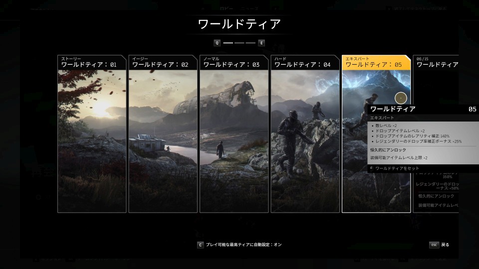 上位のワールドティアをアンロックするには、その時点で選べる最高のティアを選択し、敵を倒して得られる経験値でワールドティアの進行ゲージを満たす必要がある。通常の経験値とは違い、クエストを完了してもワールドティアの進行ゲージは上昇しない。ワールドティアの進行ゲージは画面の上端に黄色で表示されている。