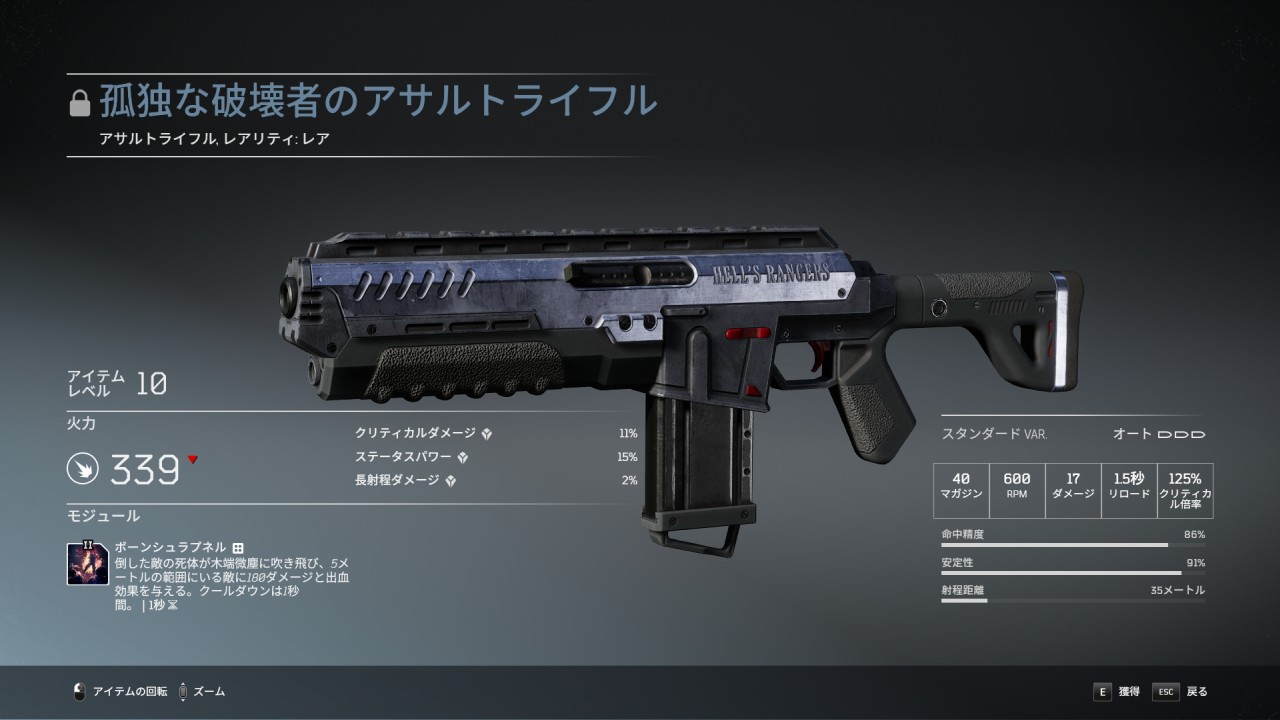 ボーナス特性にアーマー貫通、ステータスパワー、長射程ダメージ、武器モジュールにボーンシュラプネルが付いている。