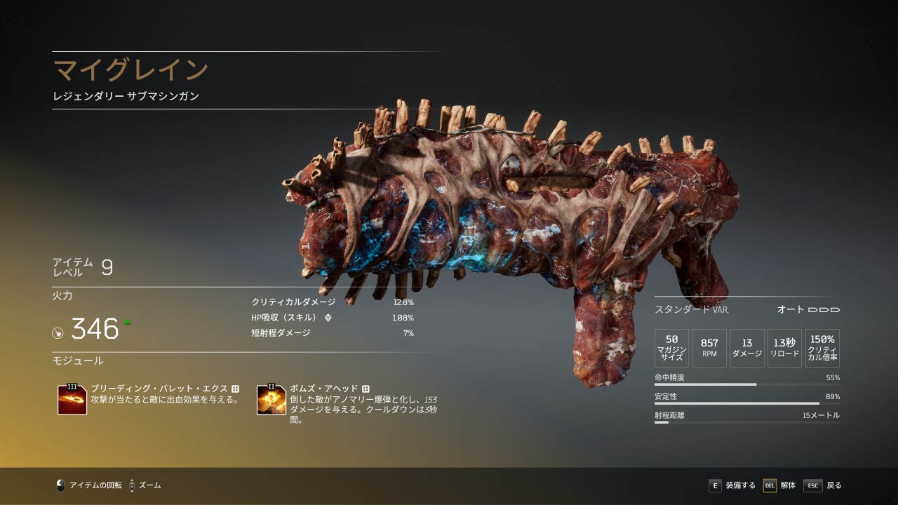 ボーナス特性にクリティカルダメージ、HP吸収 (スキル)、短射程ダメージ、武器モジュールにボムズ・アヘッドとブレインイーターが付いている。