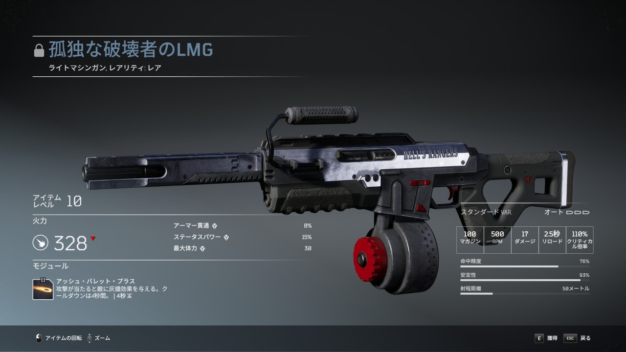| 100 マガジン サイズ | 500 RPM | 2.5秒 リロード | 110% クリティ カル倍率 |