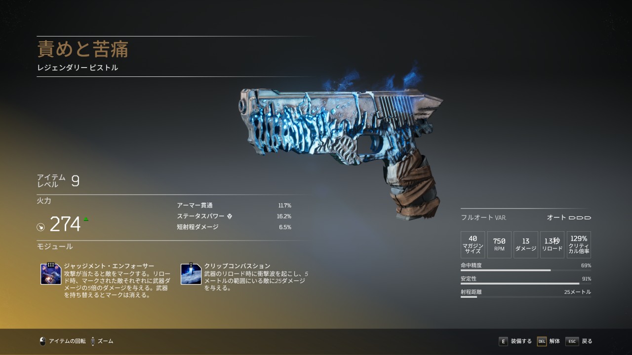 責めと苦痛は、ランダムでドロップするレジェンダリーのピストルで、デフォルトのバリエーションはフルオート。