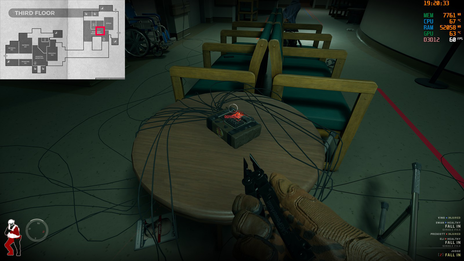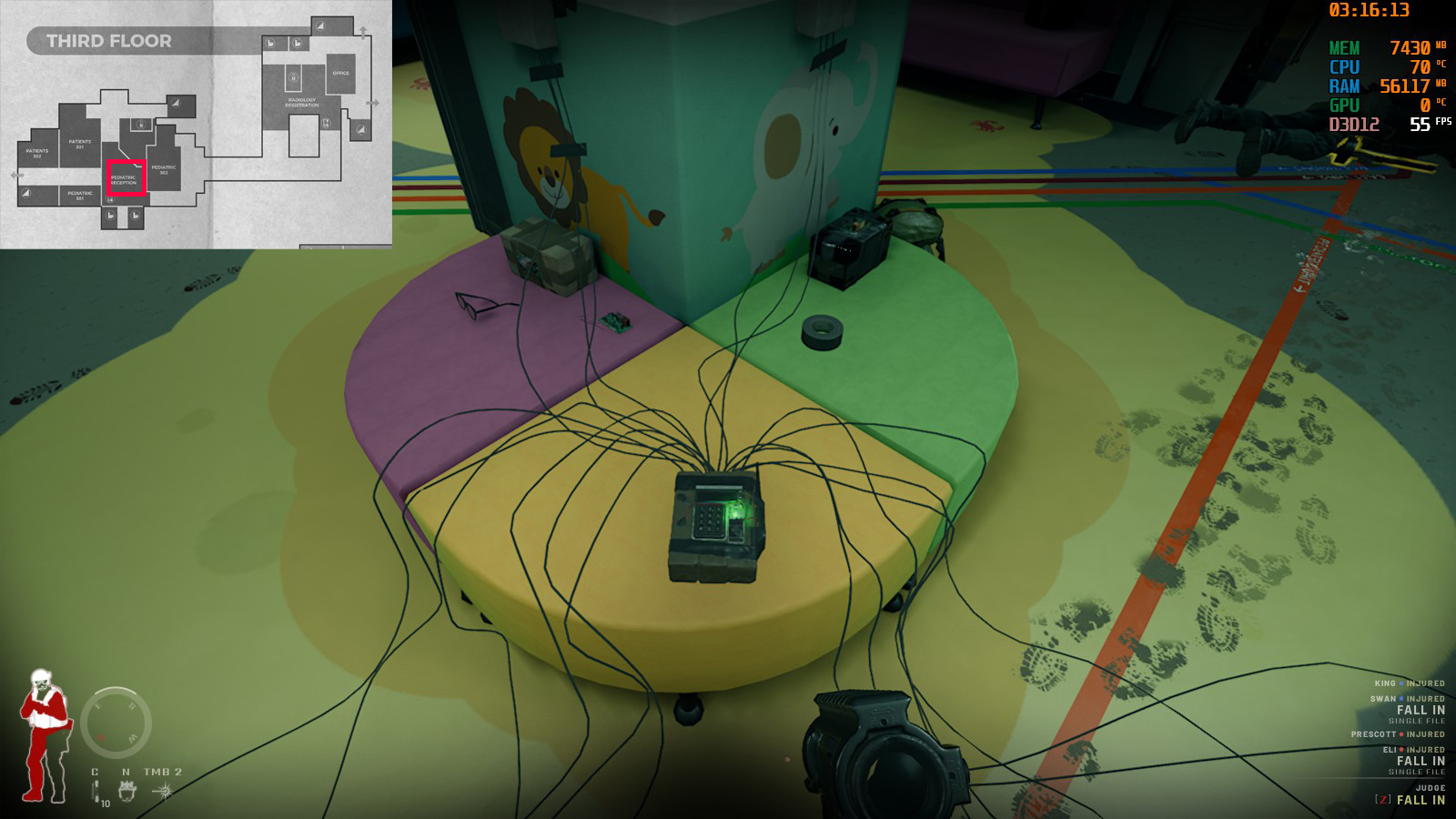 彼は「Hospital Main Lobby」からスタートした場合の棟の2FにあるICU付近にいる。