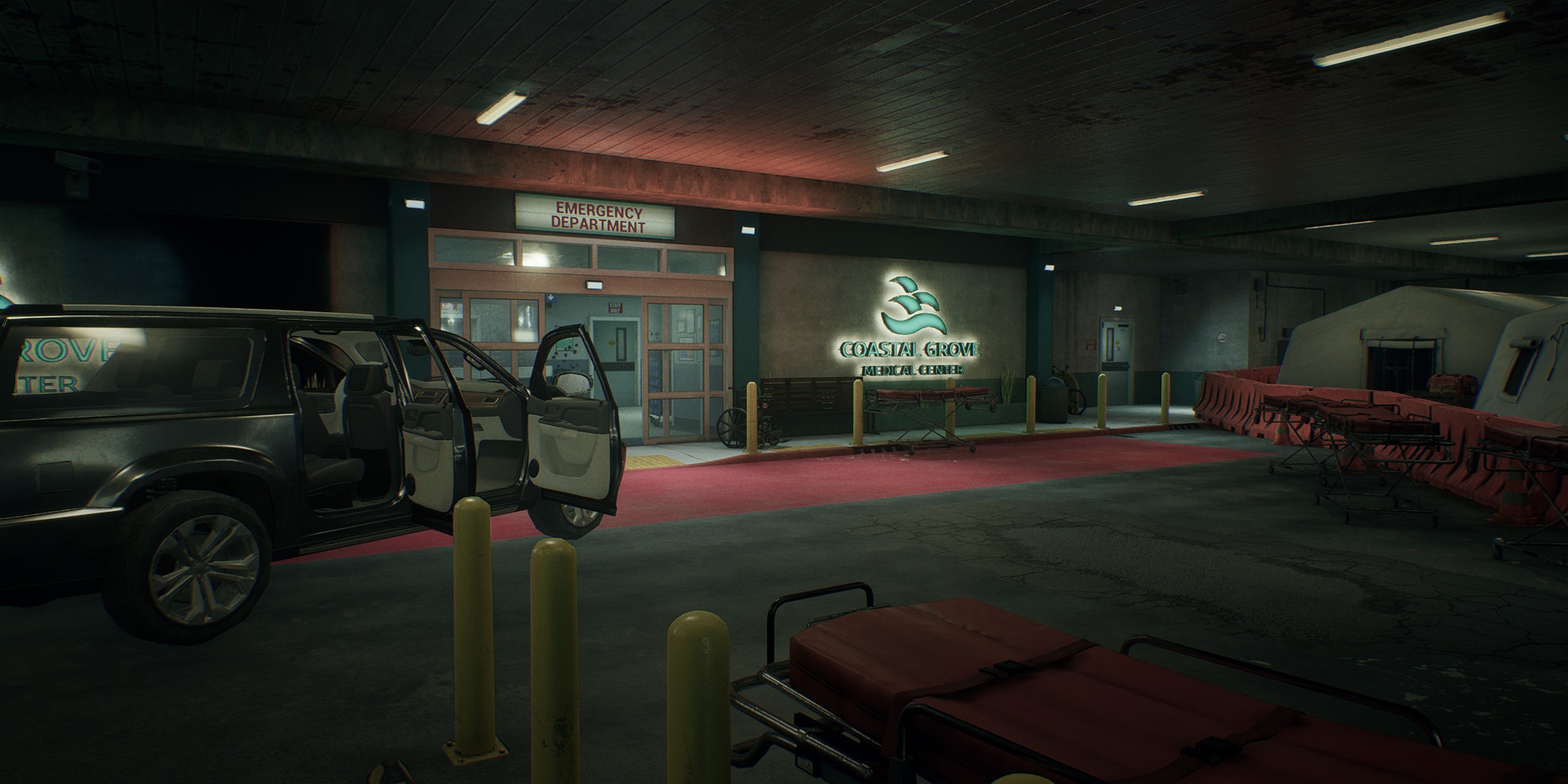 主要なエントリーポイントは「Underground Parking Lot Entrance」と「Hospital Main Lobby」の二つがある。
