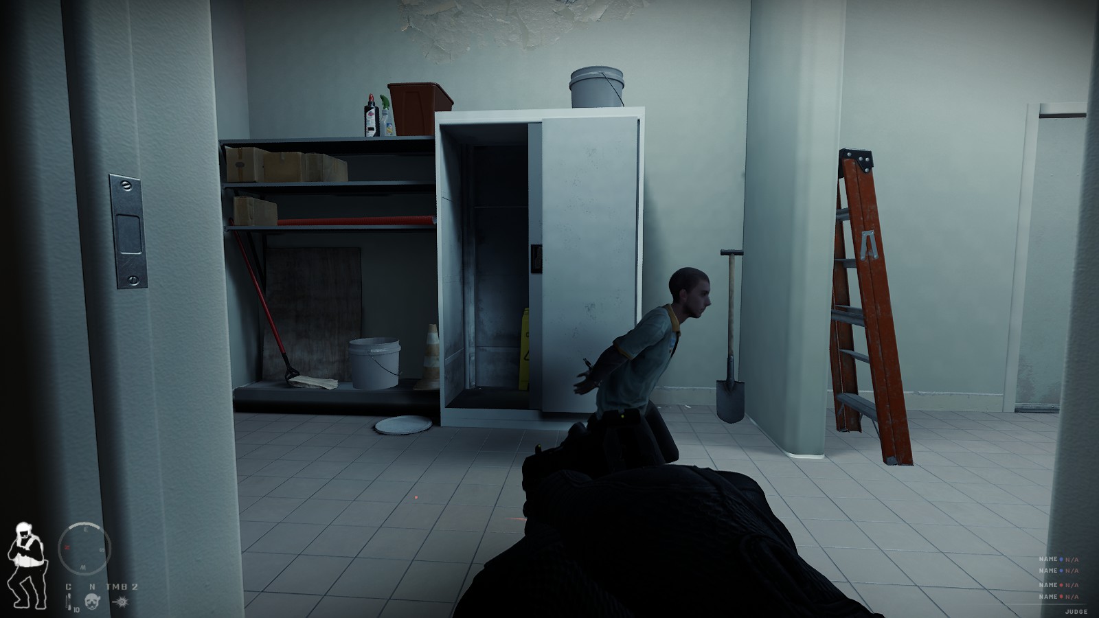 左側の鉄製ドアは高確率で鍵がかかっており何故かピッキングできないのでドアキックが必須 (1.0になってもなおなぜか不可、NPCへの指示では可能) となるが、コンビニ・レストラン・レジ裏へ繋がっているため各所へエントリーしやすいためおすすめ。
