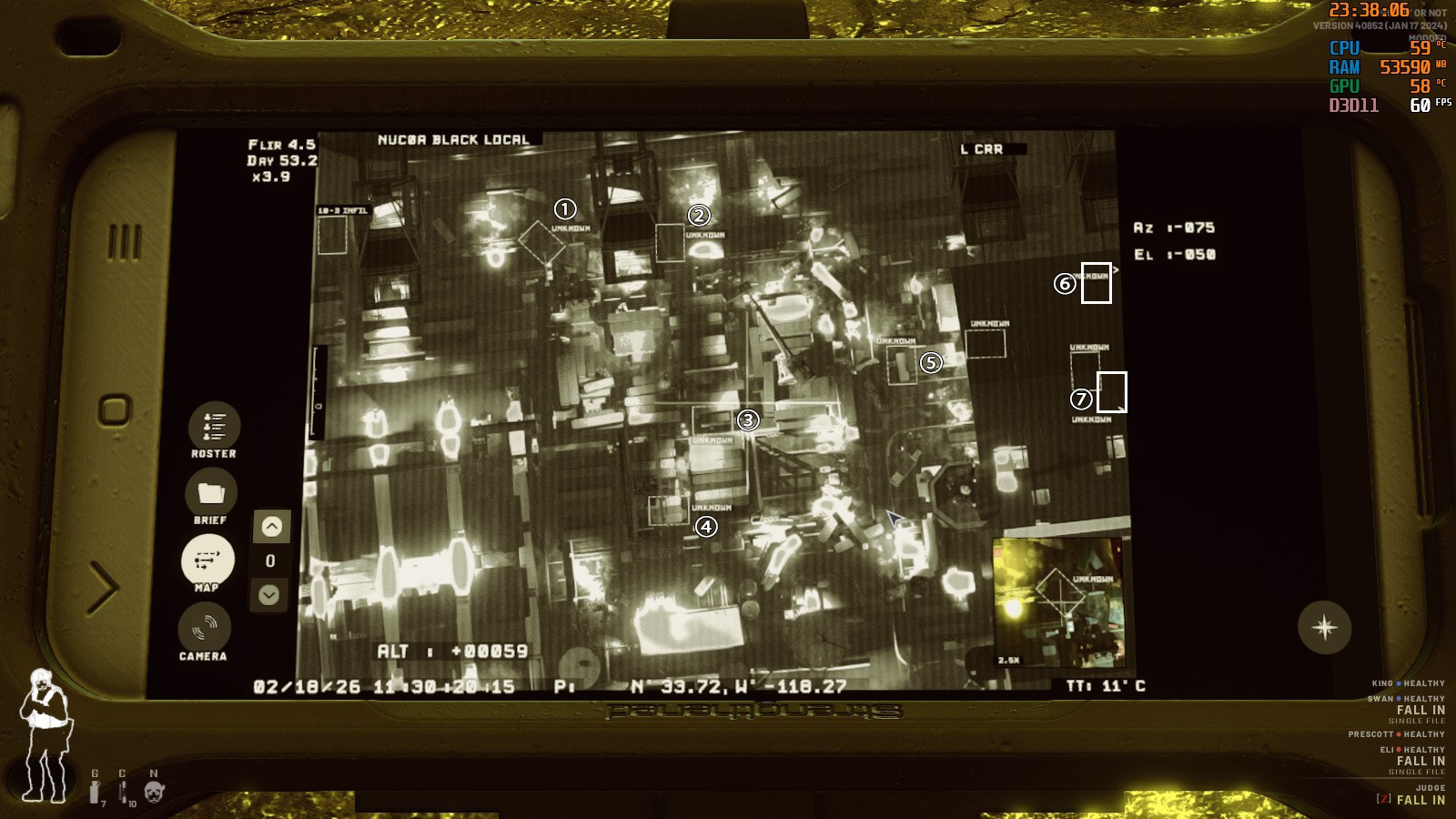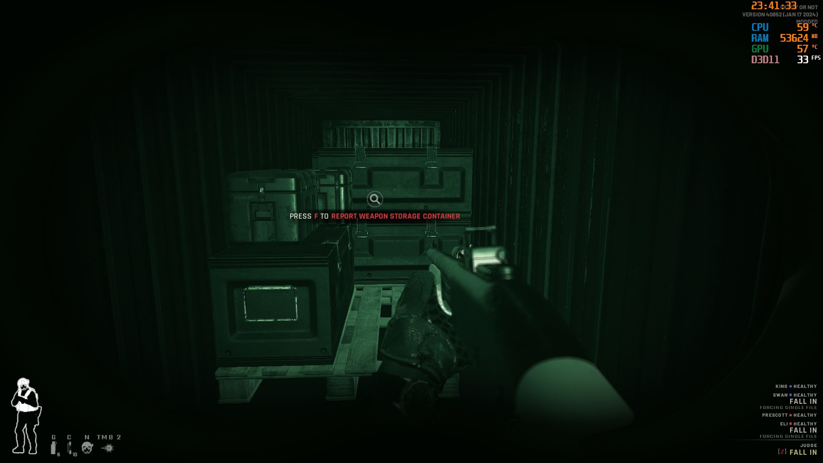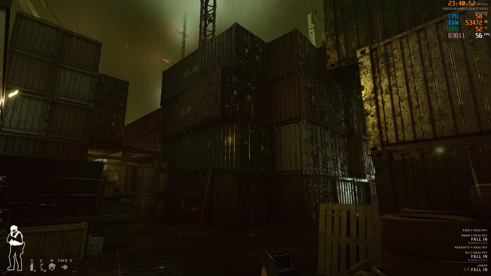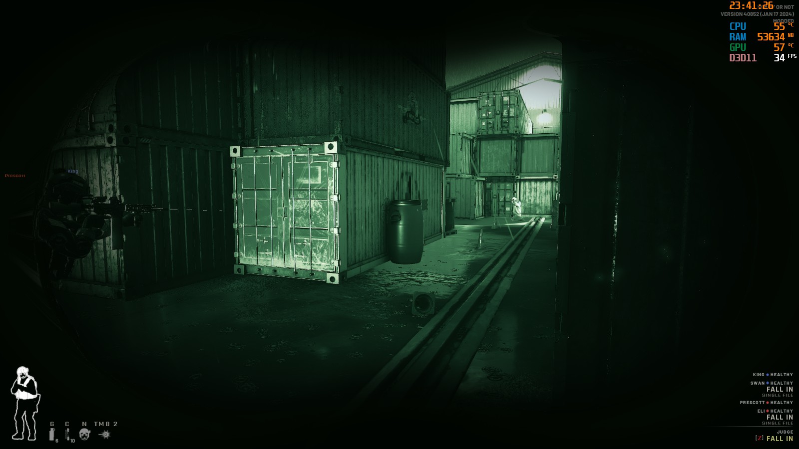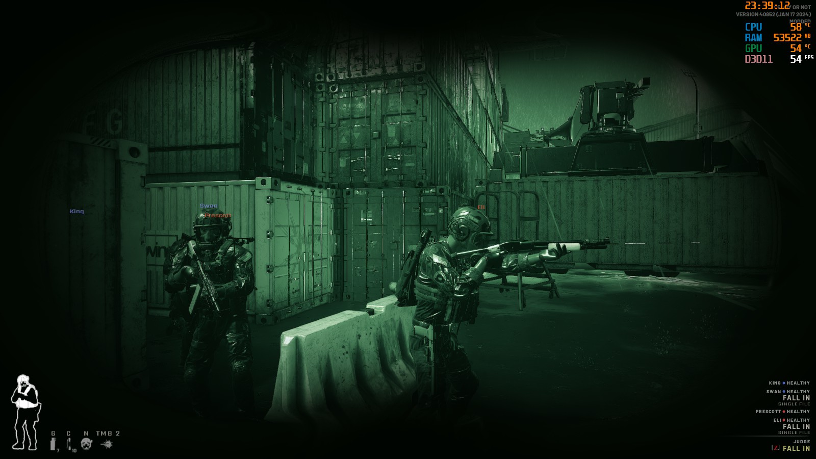また、マップ全域でライトアップされておりそこそこ明るいが、敵が黒い服を来ていたり視認性が悪いのでナイトビジョンを装備しておくとクリアリングが楽になる。