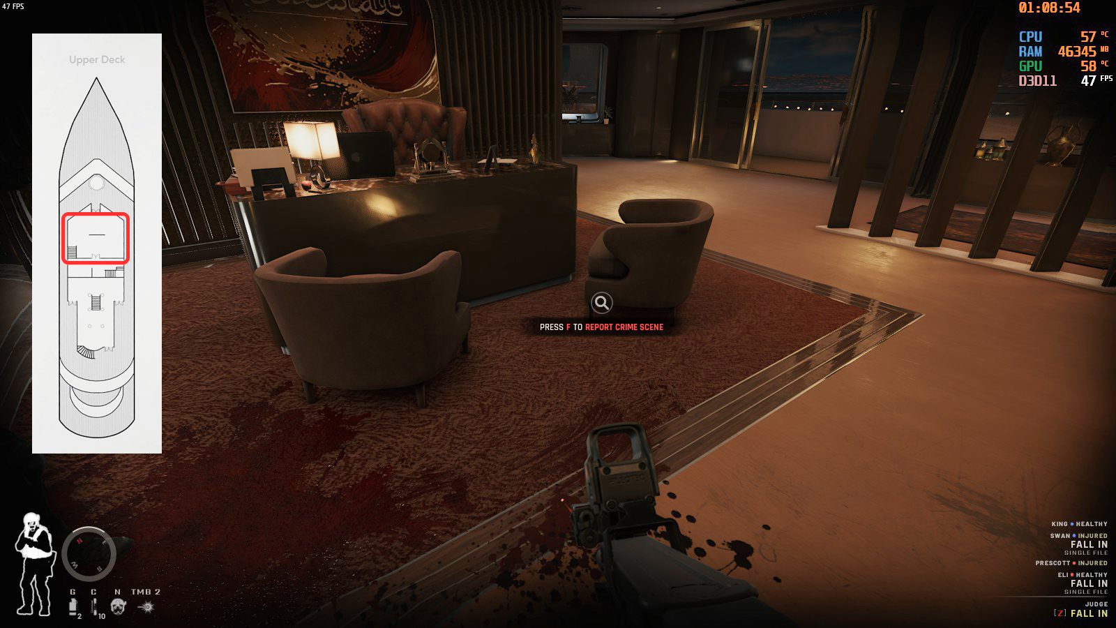 Upper Deckは眼の前が容疑者が多い部屋なので開始時点で撃たれることがある。